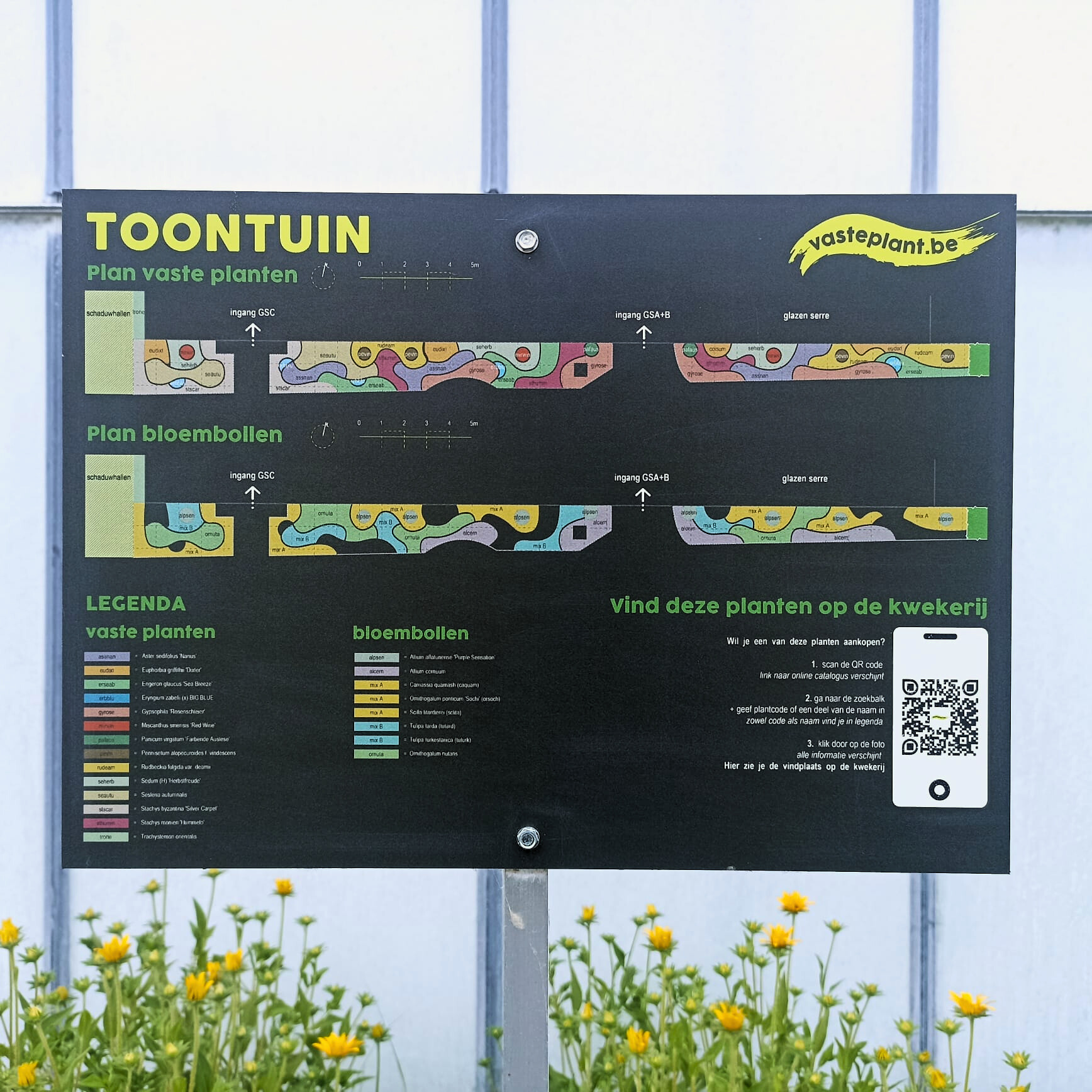 Soms kom je op de kwekerij lege of 'minder propere' borders tegen. Dat wil niet zeggen dat deze verwaarloosd worden, integendeel. Dit betekent dat we ze opfrissen, en dat we de planten vervangen door andere of nieuwe planten uit het sortiment, om jou als klant frisse inspiratie te geven voor jouw eigen border. Of we willen een bepaalde plant beter leren kennen, en dat gaat net iets beter als we haar kunnen bestuderen in volle grond. Bij onze nieuwste borders plaatsen we voortaan een plakkaat waarop een duidelijk overzicht staat van alle planten in de border.